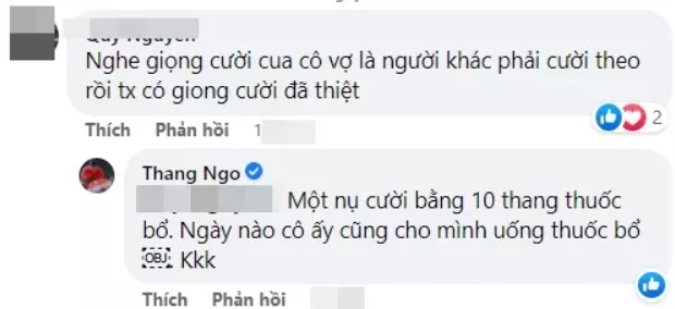 Anh và bà xã có nhân sinh quan giống nhau, hòa hợp tính cách và tương đồng suy nghĩ. "Một nụ cười bằng mười thang thuốc bổ, ngày nào cô ấy cũng cho mình uống thuốc bổ", Thắng Ngô hào hứng.