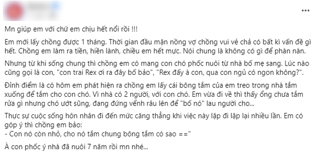 Đỉnh điểm là có hôm em phát hiện ra chồng lấy cái bông tắm của em để tắm cho con chó. Vì nhà có 2 người, với con chó. Em vừa đi về thì thấy ông chưa tắm rửa gì nhưng con chó ướt sũng, đang đứng vểnh râu lên để "bố nó" lau người cho...
