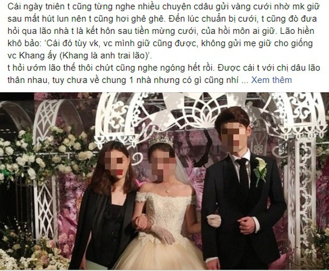 "Cái ngày còn thanh niên em cũng từng nghe nhiều chuyện con dâu gửi vàng cưới nhờ mẹ chồng giữ sau mất hút luôn nên em cũng hơi ghê ghê. Đến lúc chuẩn bị cưới, em cũng đò đưa hỏi qua lão nhà em là kết hôn xong tiền mừng cưới, của hồi môn ai giữ. Lão hiền khô bảo: 'Cái đó tùy em, vợ chồng mình giữ cũng được, không gửi mẹ giữ cho giống vợ chồng anh Khang ấy (Khang là anh trai lão)'.