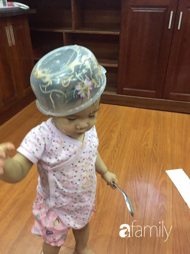 "Có nhà bác nào 1 năm 2 đứa như nhà em không? Con gái mà nghịch banh nóc nhà, mẹ dọn nhà vừa xong mắt trước mắt sau lại đi tong cái công dọn nhà. Đây là 1 kiệt tác nghệ thuật của các con".