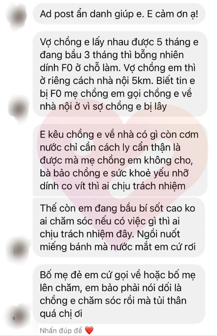 "Mình đang bầu 3 tháng thì test lên dương tính. Mẹ chồng biết chuyện gọi ngay chồng mình về nhà nội vì sợ mình lây cho chồng. Bảo là chồng thể trạng kém nhỡ lây sang thì ai chịu trách nhiệm. F0 một mình ngồi cắn miếng bánh mà thấy tủi quá mọi người ạ… Bố mẹ đẻ cứ gọi bảo là hay về nhà đi hoặc bố mẹ lên chăm nhé mà toàn phải nói dối là có chồng ở đây chăm rồi bố mẹ khỏi lo", cô viết.