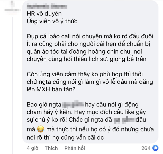 - HR vô duyên, ứng viên vô ý thức. Đụp cái bảo call nói chuyện mà không rõ đầu đuôi, ít ra cũng phải cho người cái hẹn để chuẩn bị quần áo, tóc tai đoàng hoàng chỉn chu, nói chuyện cũng hơi thiếu lịch sự, giọng bề trên. Còn ứng viên cảm thấy không phù hợp thì thôi chứ ngta cũng nói gì làm gì vô lễ đâu mà đăng lên mạng xã hội bàn tán?