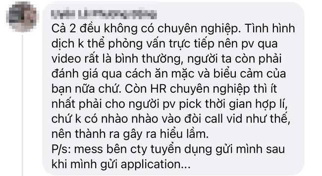 - Cả 2 đều không có chuyên nghiệp. Tình hình dịch không thể phỏng vấn trực tiếp nên phỏng vấn qua video rất là bình thường. Người ta còn phải đánh giá qua cách ăn mặc và biểu cảm của bạn nữa chứ. Còn HR chuyên nghiệp thì ít nhất phải cho người phỏng vấn chọn thời gian hợp lí, chứ không có nhào nhào vào đòi call video như thế, nên thành ra gây ra hiểu lầm.
