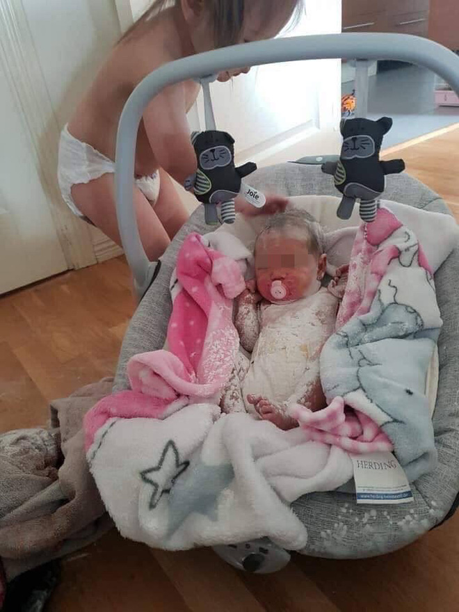 Cụ thể câu chuyện ở đây là bà mẹ đã để con gái lớn của mình trông em 1 lúc, vừa tạo "việc làm" cho con gái, vừa để 2 chị em bồi dưỡng tình cảm. Ấy thế mà vừa quay đi vài phút, quay lại mẹ trẻ đã phải choáng váng với hoàn cảnh trước mặt. Chẳng hiểu cô chị gái lấy được lọ phấn rôm ở đâu mà đã rắc hết lên người đứa em vô tội đang nằm yên trong nôi.