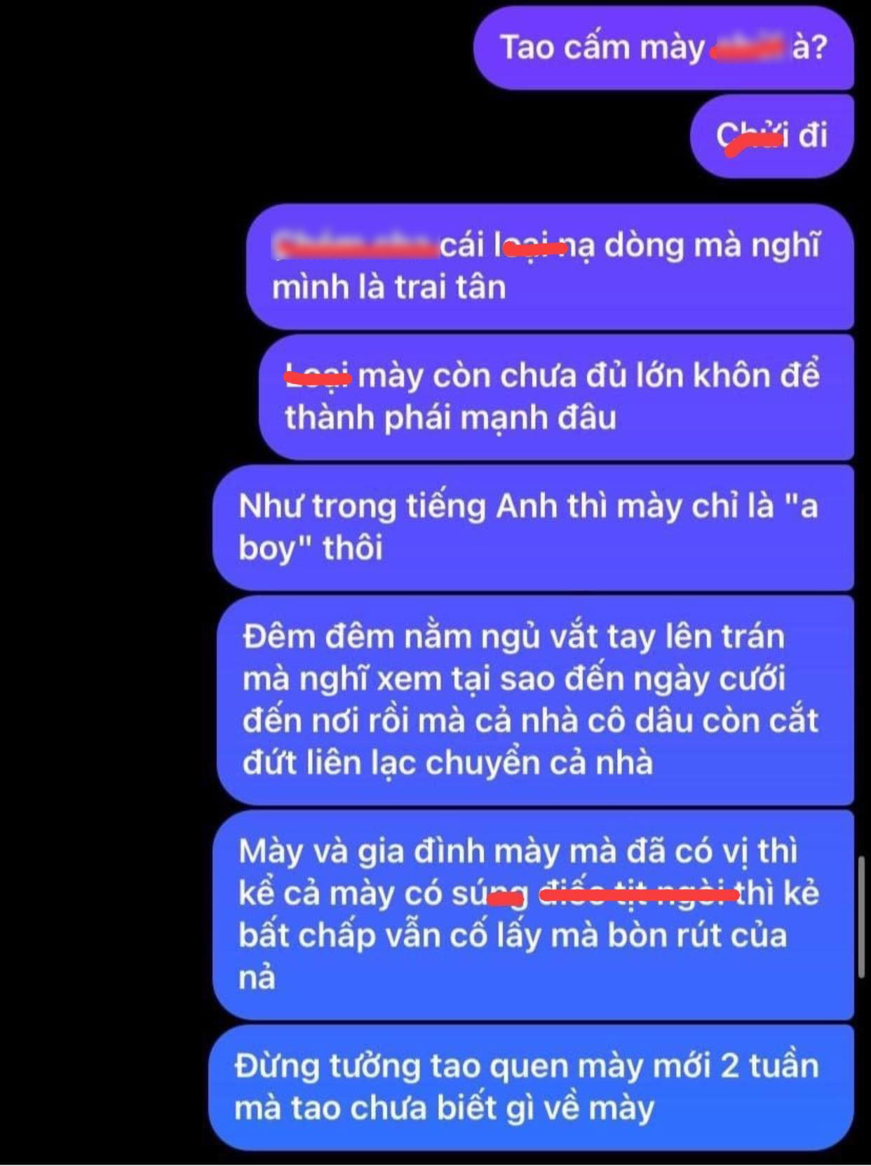 "Mình nói chuyện với anh này được mấy hôm nhưng hôm nay anh đã đưa ra những "quy tắc" làm dâu nhà anh. May cho anh là gặp con đanh đá này đấy. Chứ gặp kiểu như mẹ em là bà đào mộ sẵn cho anh rồi đó. Thân gửi tới người đàn ông rạch trời rơi xuống", cô gái chia sẻ.