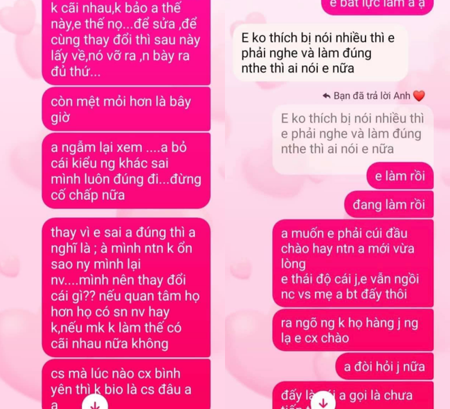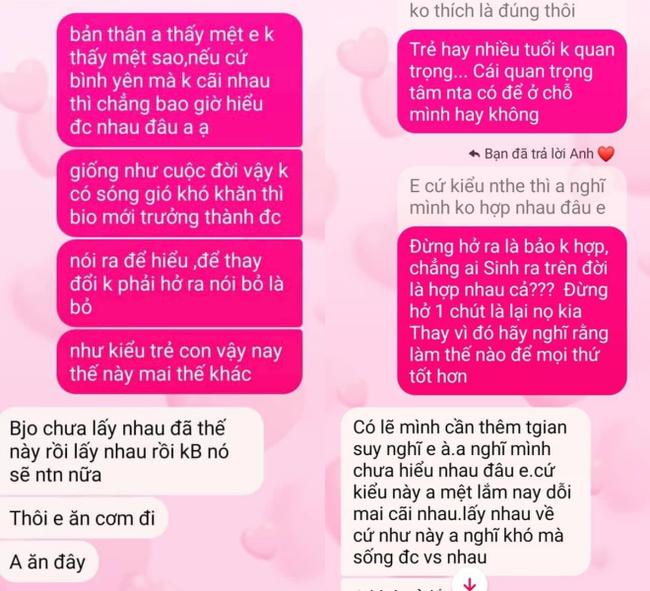 Đính kèm là những đoạn tin nhắn mà cô và chồng tương lai nhắn cho nhau. Cô gái bày tỏ sự mệt mỏi. Cô góp ý với người yêu, nói ra để anh hiểu, anh trưởng thành chứ không phải nói để bỏ như trẻ con.