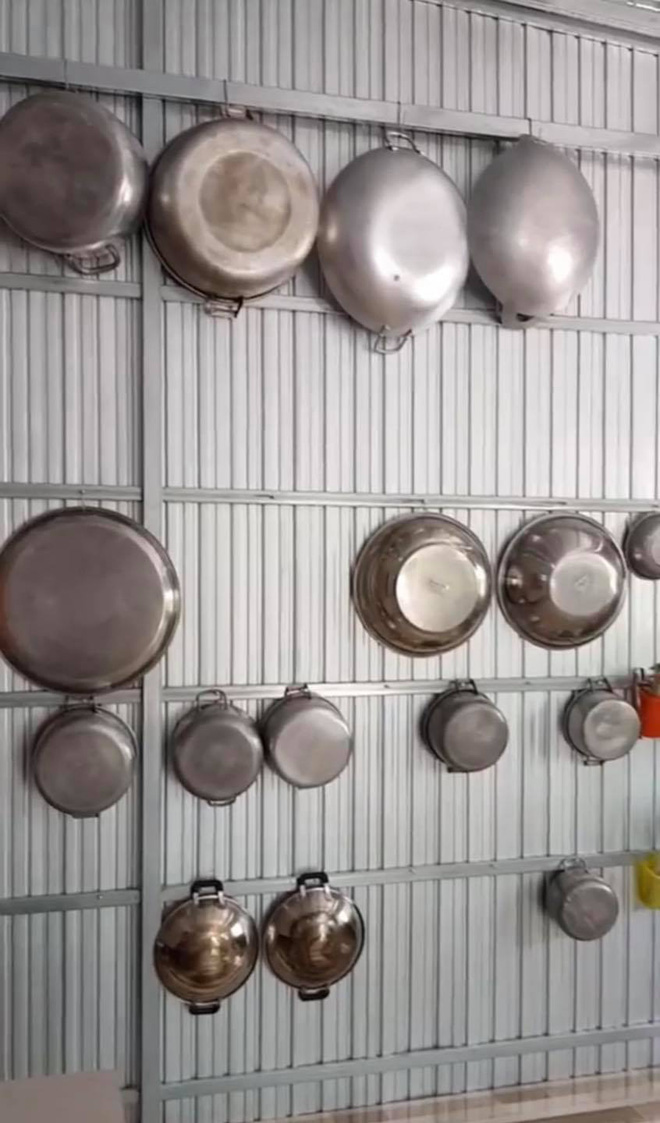 Căn bếp mộc mạc nhưng gọn gàng, sạch sẽ đến vô cùng. Những xoong nồi đã sử dụng cũng được lau chùi đến bóng sáng, sạch như chưa từng đụng đến lửa. Rổ rá cũng sạch tinh như mới. Tất cả cúng được treo ngay ngắn, gọn gàng trên một vách tôn.