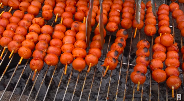 Khi vừa bắt đầu xếp xiên lên bếp nướng, bà đã liên tục dặn lòng và nhắc đứa cháu ngồi cạnh “phải trở liên tục, không nó dễ cháy lắm các cháu”. Vừa dứt lời, khi bà lật thử 1 xiên lên thì… đã cháy luôn mặt đó rồi!