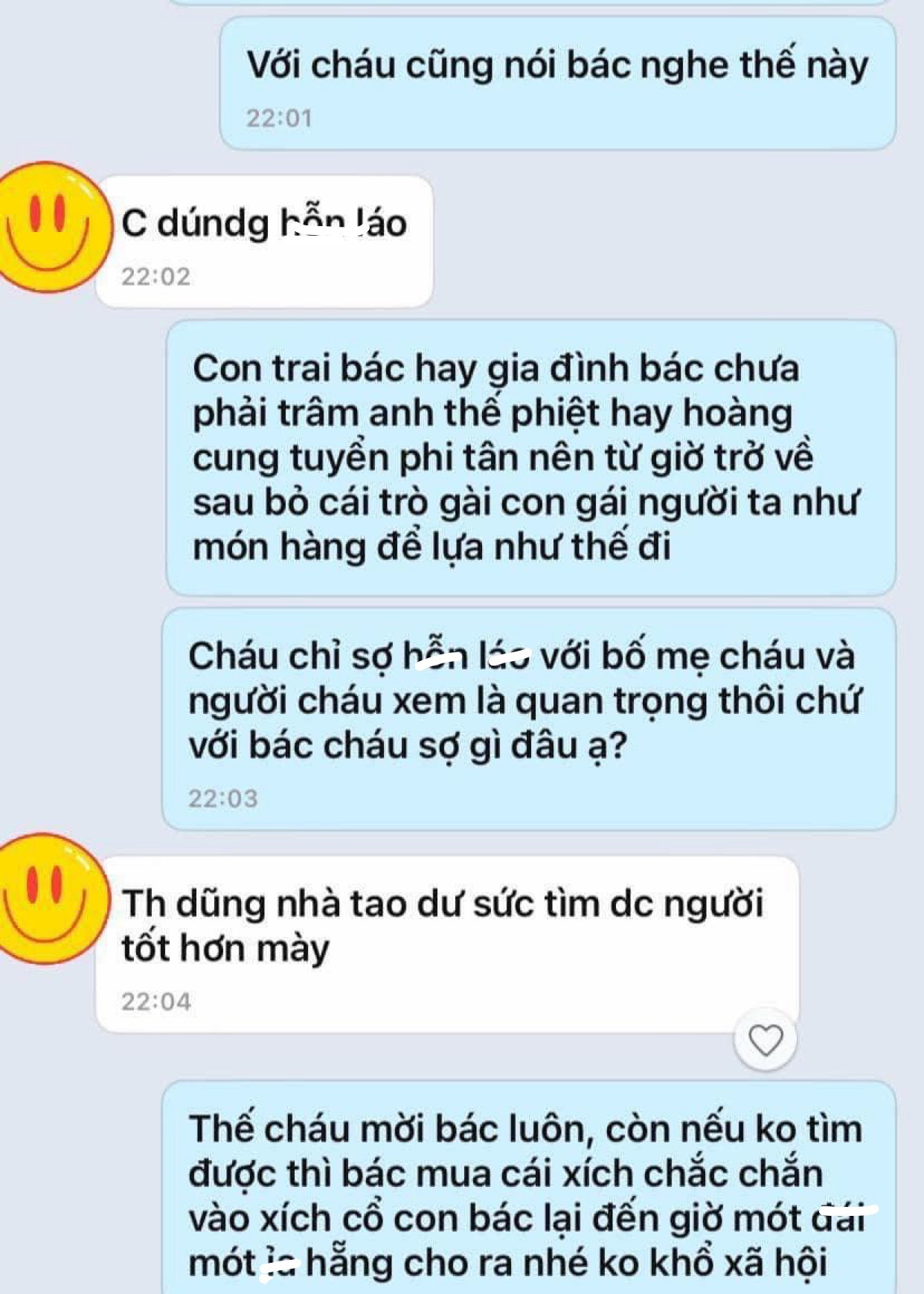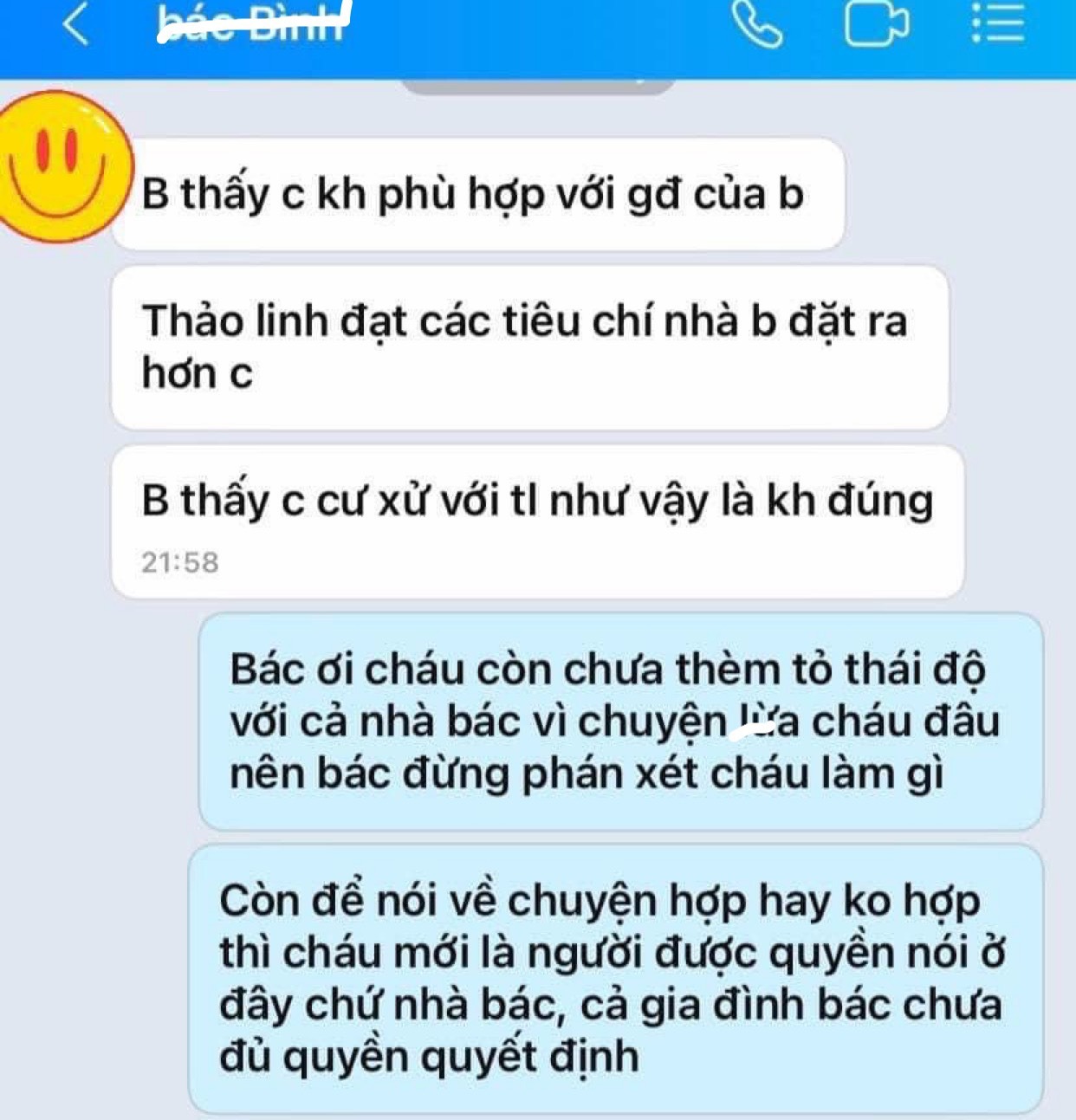 Nghe đến đấy tôi đứng dậy xin phép đi về luôn. Mặc kệ D. có nhắn tin gọi điện thế nào tôi cũng không quan tâm. Tôi nghĩ mình cần 1 chút yên tĩnh để suy nghĩ kỹ về mối quan hệ này thì bỗng dưng mẹ D. nhắn cho tôi như bên dưới.