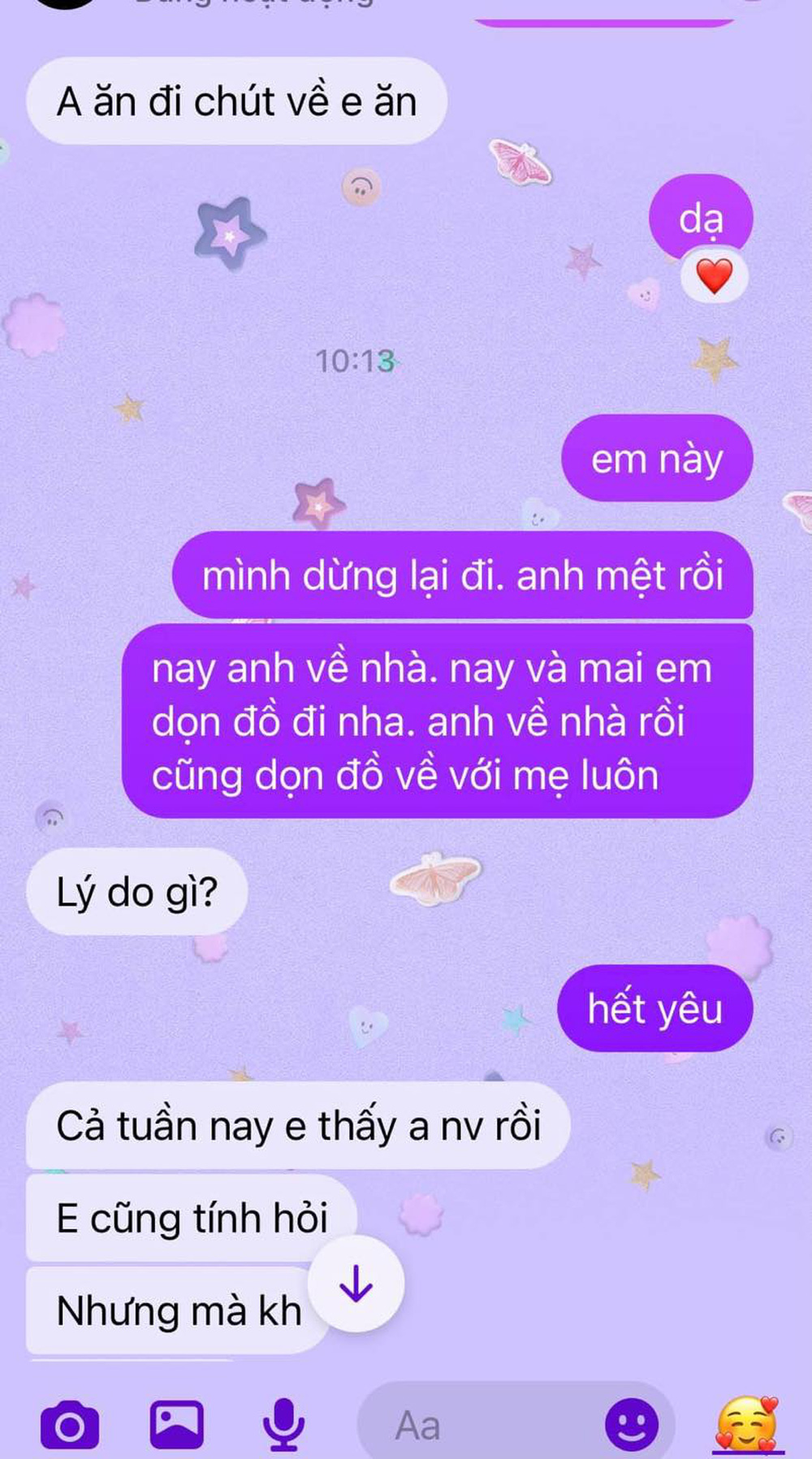 "Hôm nay mình vừa chia tay người yêu. Bọn mình quen nhau lúc mùa dịch tháng 6. Do dịch cô ấy mất việc nên quen mình cái là lên ở chung với mình luôn.