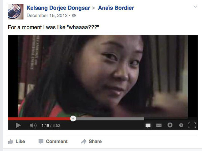 Người bạn Kelsang Dongsar đã khoe với Anais rằng anh phát hiện cô gái giống hệt Anais xuất hiện trong đoạn clip ngắn trên Youtube.