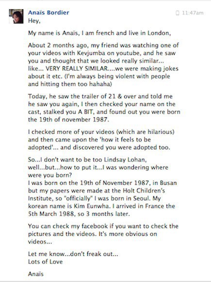Tiến hành điều tra về thông tin của Samantha, Anais phát hiện cả 2 chào đời cùng ngày 19/11/1987 tại cùng 1 nhà hộ sinh ở tỉnh Busan, Hàn Quốc. Sau đó, Anais lập tức lên Facebook, gửi tin nhắn cho Samantha.