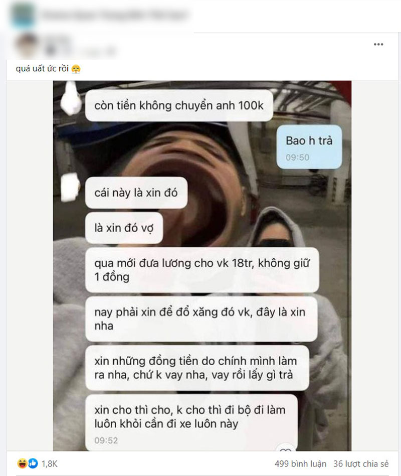 Được biết tháng nào vừa nhận lương anh cũng đều như vắt chanh nộp sạch cả 18 triệu cho vợ không dám giữ đồng nào, hôm qua cũng vậy. Đến hôm nay chuẩn bị ra đường thì nhớ ra xe gần hết xăng, anh mới nhắn tin bảo vợ chuyển cho mình 100k.