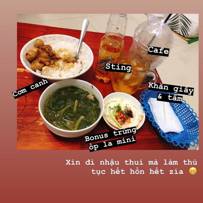 Kèm theo lời kể là bức ảnh cô chụp lại mâm cơm ngon lành khiến dân tình không khỏi ngạc nhiên. Anh chồng nấu cơm, kho thịt, làm trứng ốp la và nấu bát canh to. Không chỉ thế, anh còn mua nước ngọt và cà phê cho vợ. Chi tiết cho thấy sự tinh tế của anh chính là miếng khăn giấy và chiếc tăm. Chu đáo thế này thì vợ nỡ lòng nào cản anh đi nhậu.