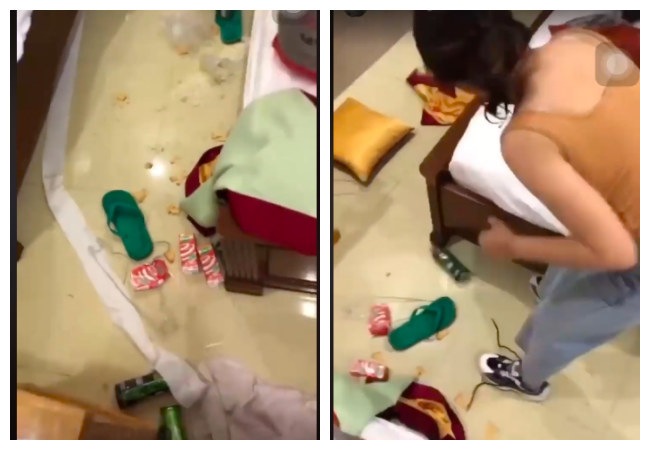 Trong đoạn clip, cô gái trẻ đang tìm cách bóp nát rồi rắc vụn bánh, quẳng đồ ăn thừa quanh phòng khách sạn. Đồ ăn thừa rồi cả các loại rác bẩn đều được cô vứt xuống gầm giường, gầm tủ, rồi vứt đầy ra cả chăn ga, gối đệm... Cô gái đang cố biến căn phòng trở nên bừa bộn nhất có thể.