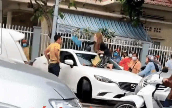 Có thể thấy trong đoạn clip là cảnh tượng một người phụ nữ đứng hẳn trên nóc capo chiếc ô tô màu trắng. Chiếc xe này được xác định là của chồng cô và trong xe còn chở cả cô nhân tình "bé nhỏ" của gã.