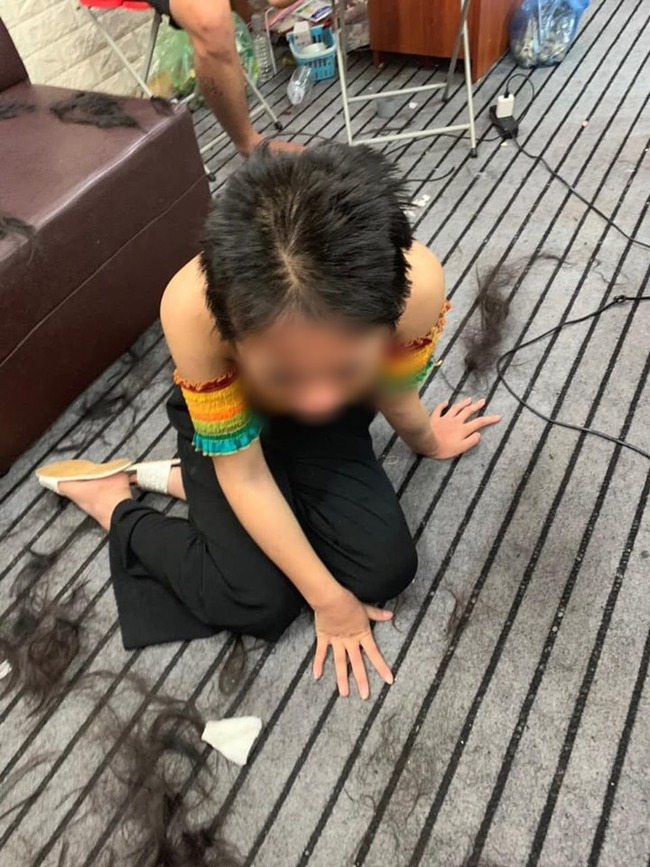 Theo đó, trong những hình ảnh được đăng tải trên mạng xã hội, cô gái trẻ đang gào khóc dã man khi bị người phụ nữ giữ chặt tay chân, cắt phăng đi mái tóc dài mà không thể phản kháng lại. Sau khi mái tóc dài bị cắt phăng đi, cô gái này chỉ còn biết lấy tay ôm đầu và che mặt vì xấu hổ.