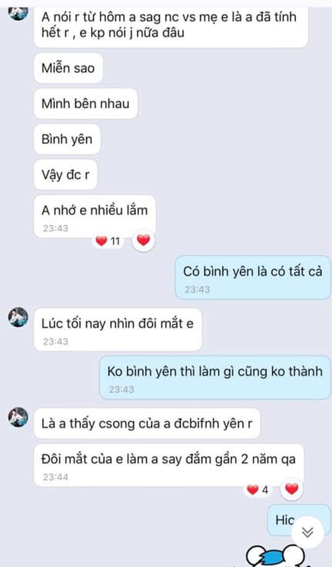 "Anh nói rồi, từ hôm sang nhà nói chuyện với mẹ em là anh tính hết rồi. Em không phải nói gì nữa đâu… Lúc tối nay nhìn vào đôi mắt em, là anh thấy cuộc sống của anh được bình yên rồi. Đôi mắt của em làm anh say đắm gần 2 năm qua", đó là những lời ngon ngọt mà anh ta gửi đến người con gái từng hết lòng vì mình.