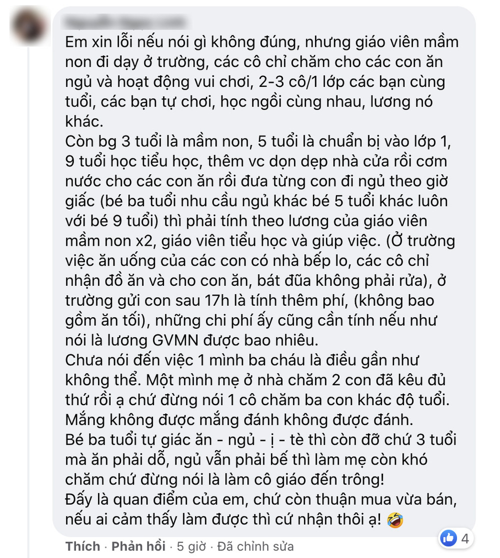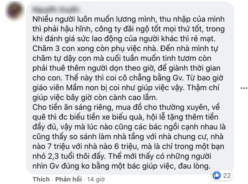 Một số cô giáo mầm non sau khi đọc bài đăng này đã cảm thấy vô cùng chạnh lòng vì phụ huynh tìm người chăm sóc con còn kiêm thêm cả giúp việc nhà. Với mức lương 400.000 đồng/ngày, nhiều người đánh giá là “bèo”, không xứng đáng với công sức mà cô bỏ ra: