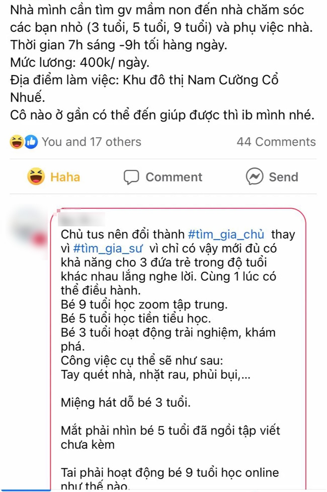 Phụ huynh này viết: “Nhà mình cần tìm giáo viên mầm non đến nhà chăm sóc các bạn nhỏ (3 tuổi, 5 tuổi, 9 tuổi) và phụ việc nhà. Thời gian từ 7h sáng đến 9h tối hàng ngày, mức lương 400.000 đồng/ngày”.