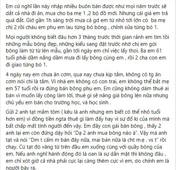 Mới đây, trong một nhóm mạng xã hội đông thành viên có một tài khoản đã chia sẻ bài viết có nội dung quầy hoa của cô gái trẻ bị 2 thanh niên tạt mắm tôm cùng lời đe doạ: "Tao cấm mày bán ở đây nữa, mai bán nữa là chết với tao!"