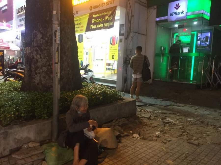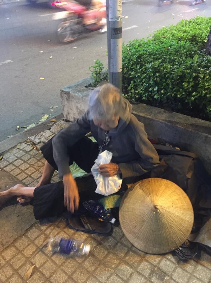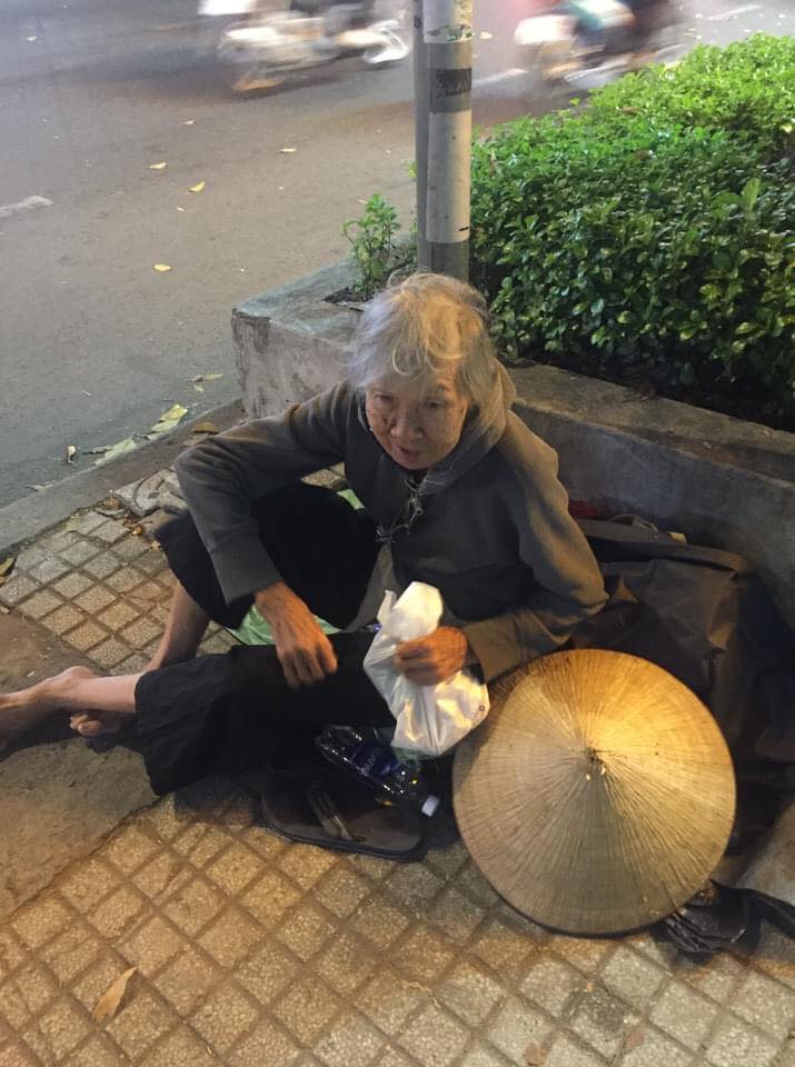 Lúc mình gặp bà đang ngồi nhai vụn bánh mì không. Bà kể ở quê bị con bỏ rơi không nuôi, bà mới theo xe khách vào Sài Gòn vì người ta nói trong này phát cơm từ thiện nhiều lắm. Nhưng mình nghĩ những ngày trời mưa hay người ta không đi phát cơm thì sao. Hỏi bà thì bà cứ nói "Ai cho gì bà ăn nấy, bà già rồi, sống được ngày nào hay ngày đó...". Nên mình đăng lên đây kêu gọi những bạn nào quen người hay đi phát cơm từ thiện có thể nhờ lưu ý bà hơn. Bạn nào ở gần Khu quận 10 có thể đi ngang qua mua giúp bà ổ bánh mì hay cái bánh bao mỗi ngày.