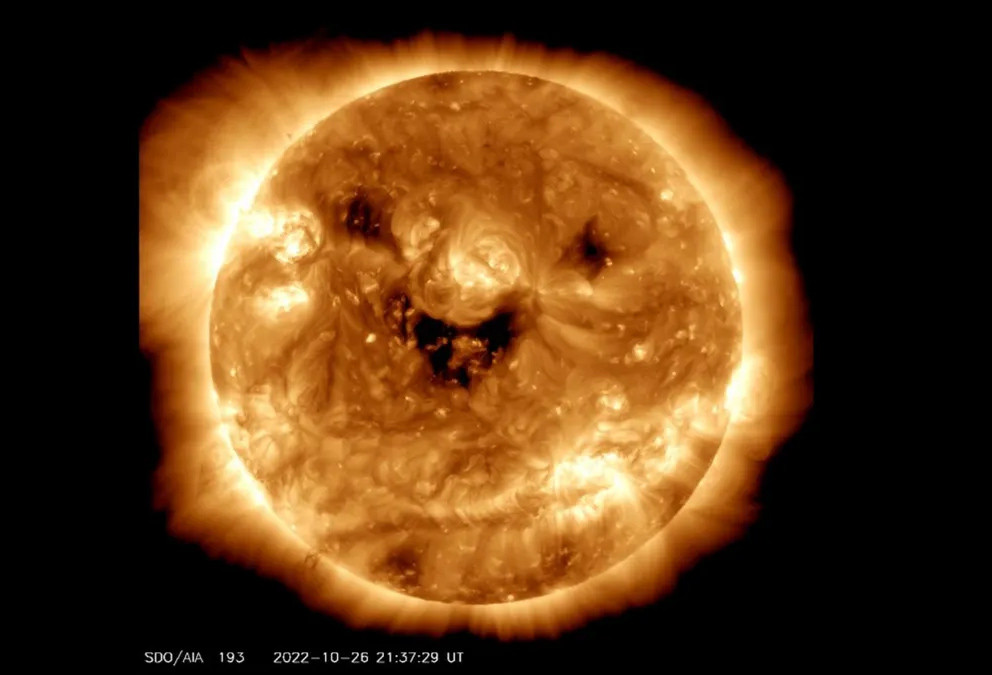 Theo NASA, Đài quan sát Động lực học Mặt trời (SDO) của NASA đã bắt gặp Mặt trời "mỉm cười" hôm 26/10 vừa qua. Nhìn dưới ánh sáng cực tím, những mảng tối này trên Mặt trời được gọi là lỗ nhật hoa và gió Mặt trời thoát ra từ lỗ này thổi ra ngoài không gian.