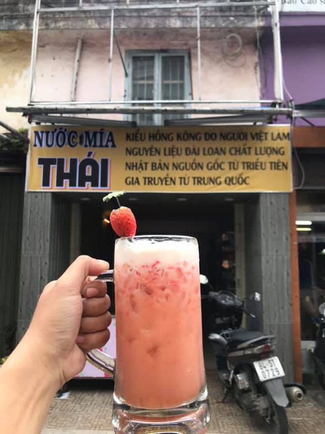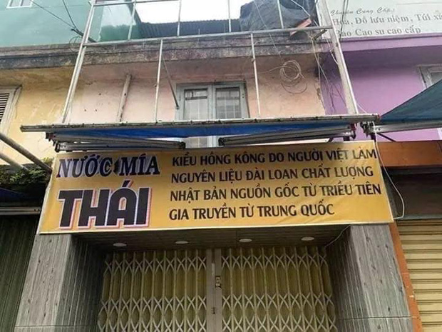 Tấm bảng hiệu này vốn là của một tiệm nước mía ở Đà Lạt. Tuy vậy, đọc xong hàng chữ nhỏ ngay bên cạnh, không ít người phải "sang chấn tâm lý" vì buồn cười: "Nước mía Thái kiểu Hồng Kông do người Việt làm, nguyên liệu Đài Loan, chất lượng Nhật Bản, nguồn gốc Triều Tiên, gia truyền từ Trung Quốc".