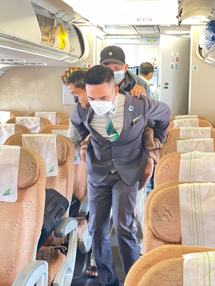 Sau hàng loạt lời "năn nỉ" nhiệt tình của nam tiếp viên cũng như sợ ảnh hưởng đến hành khách xung quanh, cụ ông 70 tuổi đã đồng để nam tiếp viên giúp đỡ cõng cha mình xuống máy bay.