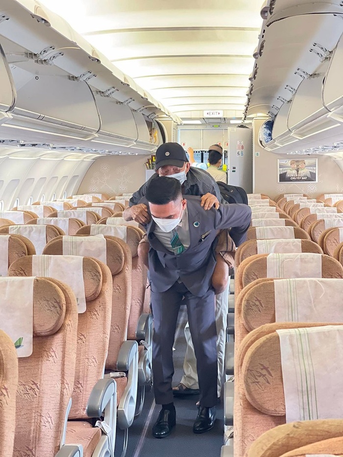 Theo lời chủ nhân bài đăng, cũng là tiếp viên trưởng có mặt trên chuyến bay, anh bắt gặp vị khách khoảng 70 tuổi dáng người gầy guộc, đang cõng một cụ ông khoảng 90 tuổi. Không chỉ thế, suốt chặng bay, cụ ông chăm sóc từng chút một cho người cha già.