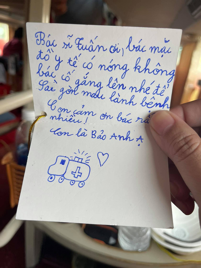 "Bác sĩ Tuấn ơi, bác mặc bộ đồ y tế có nóng không? Bác cố gắng lên nhé để Sài Gòn mau lành bệnh. Con cảm ơn bác rất nhiều. Con là Bảo Anh ạ".