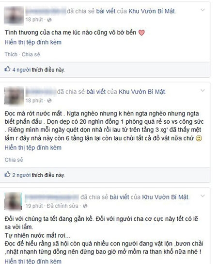 Bạn Mỹ Lệ chia sẻ: "Người ta không nhà, không cửa, không nghề, kiếm đồng tiền vắt cả sức lực và mồ hôi chứ không phải nghèo mà sinh ra trộm cướp. Tấm gương như thế này hi vong được sự quan tâm tạo công việc làm cho anh ấy. Tuy anh nghèo nhưng vẫn kiếm tiền lo cho con ăn học, thật thương!"