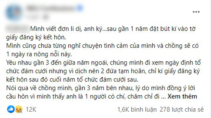 "Mình cũng chưa từng nghĩ chuyện tình cảm của mình và chồng sẽ có 1 ngày ra nông nỗi này. Yêu nhau gần 3 năm đến giữa năm ngoái, chúng mình đi xem ngày, định tổ chức đám cưới nhưng vì dịch nên 2 đứa tạm hoãn, chỉ kí giấy đăng ký kết hôn sau đó cuối năm tổ chức đám cưới sau.