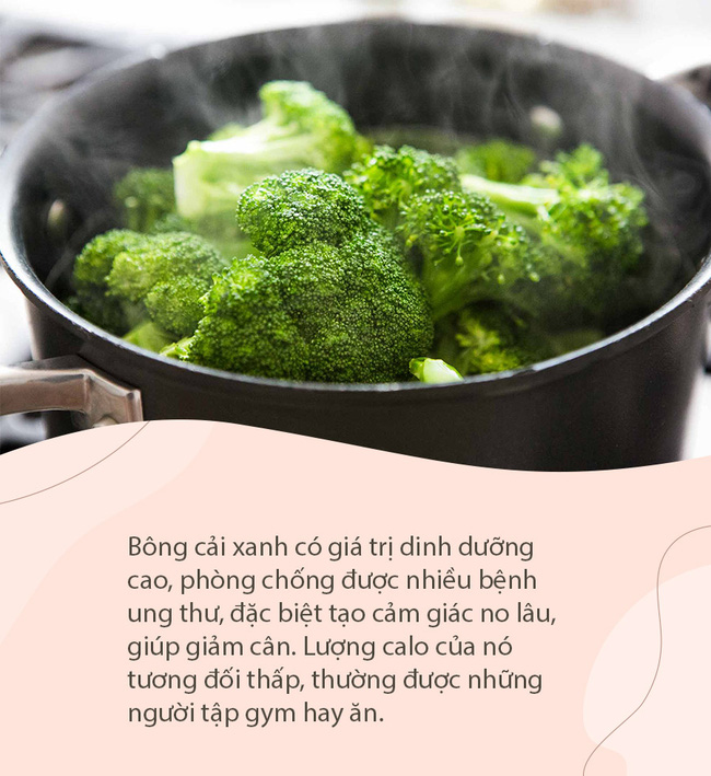 Bông cải xanh có giá trị dinh dưỡng cao, phòng chống được nhiều bệnh ung thư, tạo cảm giác no lâu. Lượng calo của nó tương đối thấp, thường được những người tập gym hay ăn. Nếu ăn vào buổi tối sẽ khiến bạn no lâu hơn, ngoài ra còn thúc đẩy nhu động đường tiêu hóa, chống táo bón, chứa nhiều loại khoáng chất và vitamin tốt cho cơ thể.