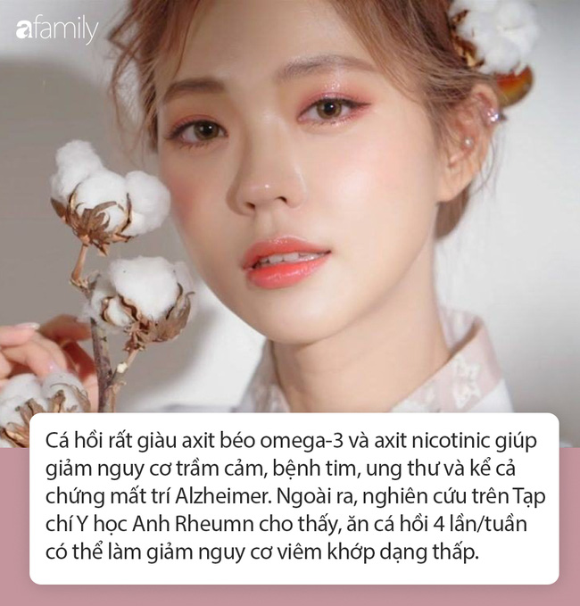 Được mệnh danh là loài cá quý hiếm nhất trên thế giới, cá hồi rất giàu axit béo omega-3 và axit nicotinic giúp giảm nguy cơ trầm cảm, bệnh tim, ung thư và cả chứng mất trí Alzheimer. Ngoài ra, các nghiên cứu trên Tạp chí Y học Anh Rheumn cho thấy, ăn cá hồi 4 lần/tuần có thể làm giảm đáng kể nguy cơ viêm khớp dạng thấp.