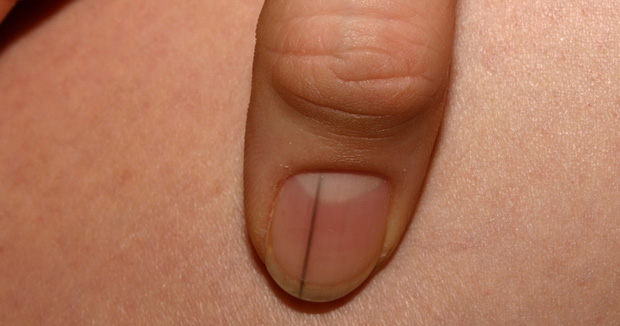 Sau khi gan bị tổn thương, móng tay cũng sẽ có hiện tượng xuất hiện sọc đen. Bạn có thể quan sát sức khỏe của gan qua móng tay nên khi gan có vấn đề thì móng tay sẽ có hiện tượng như vậy.