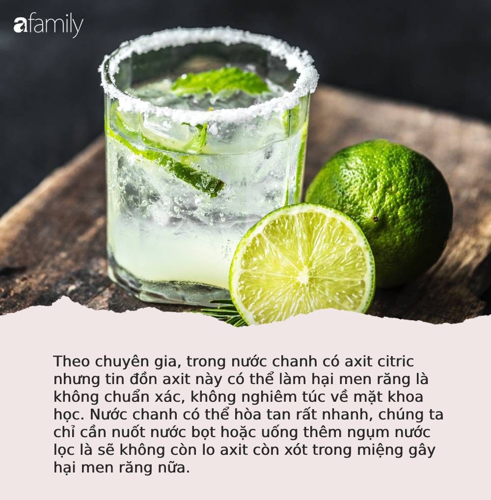 Theo chuyên gia, trong nước chanh có axit citric nhưng tin đồn axit này có thể làm hại men răng là không chuẩn xác, không nghiêm túc về mặt khoa học. Nước chanh có thể hòa tan rất nhanh, chúng ta chỉ cần nuốt nước bọt hoặc uống thêm ngụm nước lọc là sẽ không còn lo axit còn xót trong miệng gây hại men răng nữa.