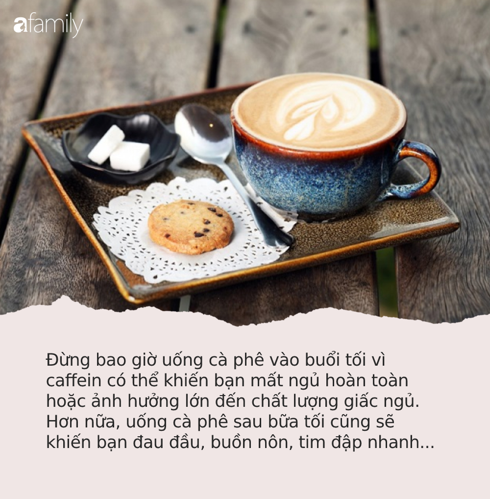 Cà phê được nhiều người biết đến như một đặc sản của bữa sáng vì nó giúp cải thiện tâm trạng, thúc đẩy quá trình trao đổi chất, tăng cường sự minh mẫn và giúp não bộ tập trung tốt hơn. Tuy nhiên, đừng bao giờ uống cà phê vào buổi tối vì caffein có thể khiến bạn mất ngủ hoàn toàn hoặc ảnh hưởng lớn đến chất lượng giấc ngủ. Hơn nữa, uống cà phê sau bữa tối cũng sẽ khiến bạn gặp triệu chứng khó chịu như đau đầu, buồn nôn, tim đập nhanh, đau dạ dày...