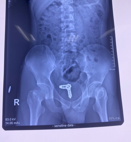 Tại Đơn vị Nam khoa, qua thăm khám lâm sàng và làm các xét nghiệm, chụp X-quang bụng, các bác sĩ xác định dị vật là chuỗi hạt kim loại có từ tính dính với nhau thành chuỗi đang nằm trong bàng quang của người bệnh. Dị vật gây tổn thương bàng quang là nguyên nhân khiến bệnh nhân tiểu ra máu.