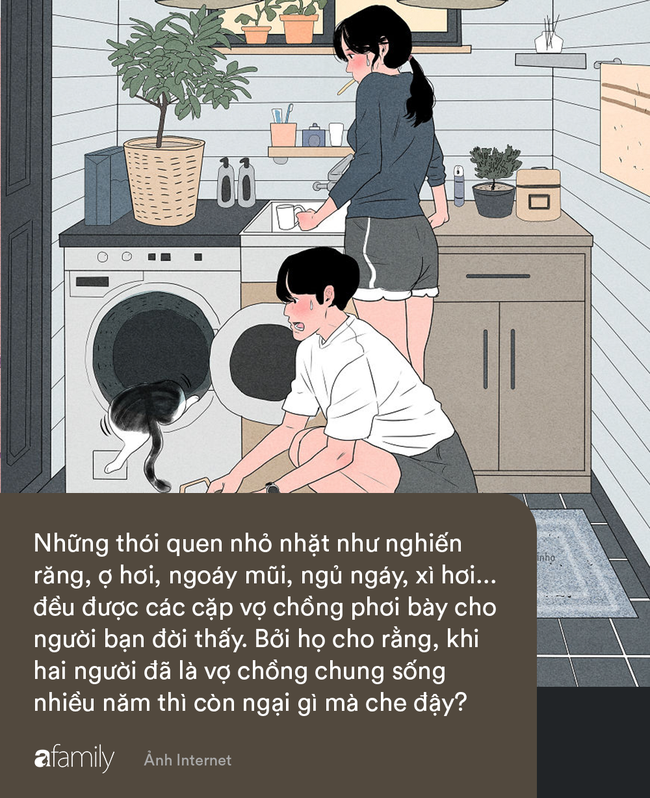 Người bạn của tôi từng nói rằng, khi cô ấy phát hiện người bạn đời sử dụng nhà vệ sinh và không đóng cửa, cô ấy đã nhận thức đời sống vợ chồng của hai người đang trở nên tùy hứng và buông thả. Những thói quen nhỏ nhặt như nghiến răng, ợ hơi, ngoáy mũi, ngủ ngáy, xì hơi... đều được các cặp vợ chồng phơi bày cho người bạn đời thấy. Bởi họ cho rằng, khi hai người đã là vợ chồng chung sống nhiều năm thì còn ngại gì mà che đậy?