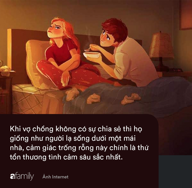 Hà Cảnh - người dẫn chương trình truyền hình nổi tiếng ở Trung Quốc, nói rằng: "Mối quan hệ vợ chồng thân thuộc nhất không phụ thuộc vào diện mạo của đôi bên, không liên quan đến túi tiền của nhau, thậm chí không dính dáng đến sự chung thủy, mà chính là sự chia sẻ từ cả hai phía". Khi vợ chồng không có sự chia sẻ thì họ giống như người lạ sống dưới một mái nhà, cảm giác trống rỗng này chính là thứ tổn thương tình cảm sâu sắc nhất.