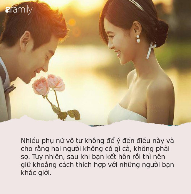 Nhiều phụ nữ vô tư không để ý đến điều này và cho rằng hai người không có gì cả, không phải sợ. Tuy nhiên, sau khi bạn kết hôn rồi thì nên giữ khoảng cách thích hợp với những người bạn khác giới. Điều này tốt cho hai vợ chồng bạn. Đàn ông chẳng bao giờ thích vợ mình quá thân với ai khác giới trừ anh ấy đâu.