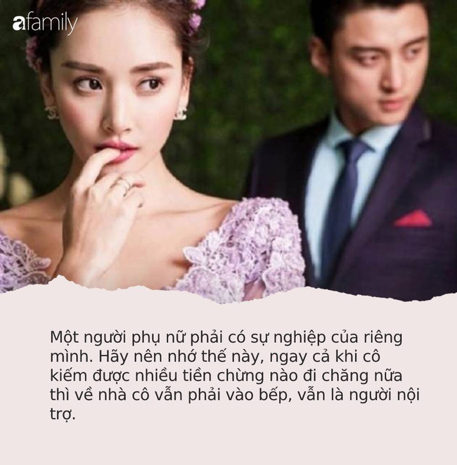 Một người phụ nữ phải có sự nghiệp của riêng mình. Hãy nên nhớ thế này, ngay cả khi cô kiếm được nhiều tiền chừng nào đi chăng nữa thì về nhà cô vẫn phải vào bếp, vẫn là người nội trợ. Đừng bao giờ tự biến mình thành một bà nội trợ toàn thời gian, hi sinh bản thân mình.