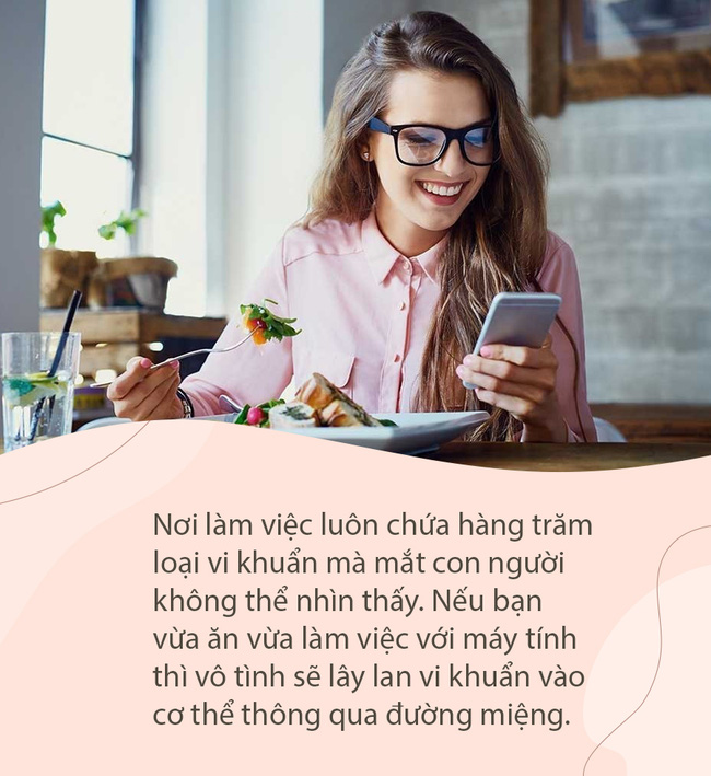 Cụ thể, nơi làm việc luôn chứa hàng trăm loại vi khuẩn mà mắt con người không thể nhìn thấy. Một vài vật dụng thường là "ổ bệnh" có thể liệt kê như bàn phím, con chuột hay tay nắm cửa… Nếu bạn vừa ăn vừa làm việc với máy tính thì vô tình sẽ lây lan vi khuẩn vào cơ thể thông qua đường miệng.