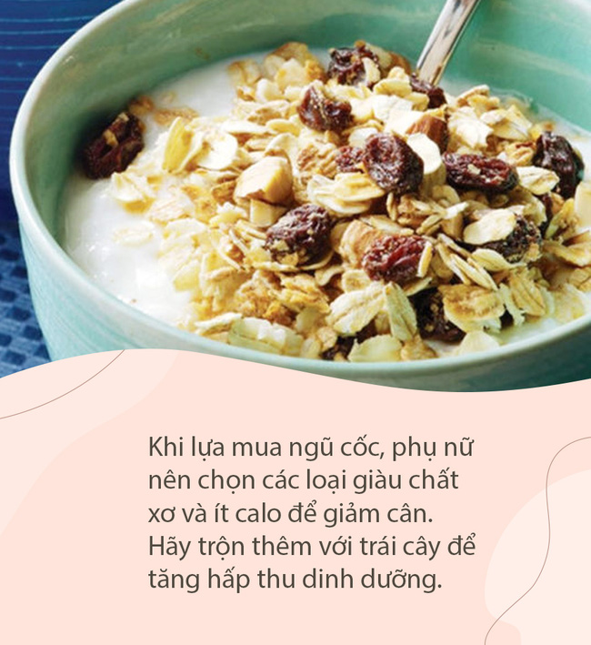 Khi sử dụng ngũ cốc cho mục đích giảm cân, phụ nữ cần lựa mua những loại giàu chất xơ và ít calo, chỉ cần chịu khó đọc thành phần dinh dưỡng là biết ngay. Thêm vào đó, bạn nên trộn thêm trái cây vào để vừa ngon lại tăng hấp thu dưỡng chất, từ đó ngăn ngừa những cơn thèm ăn vặt và đói bụng trong ngày.