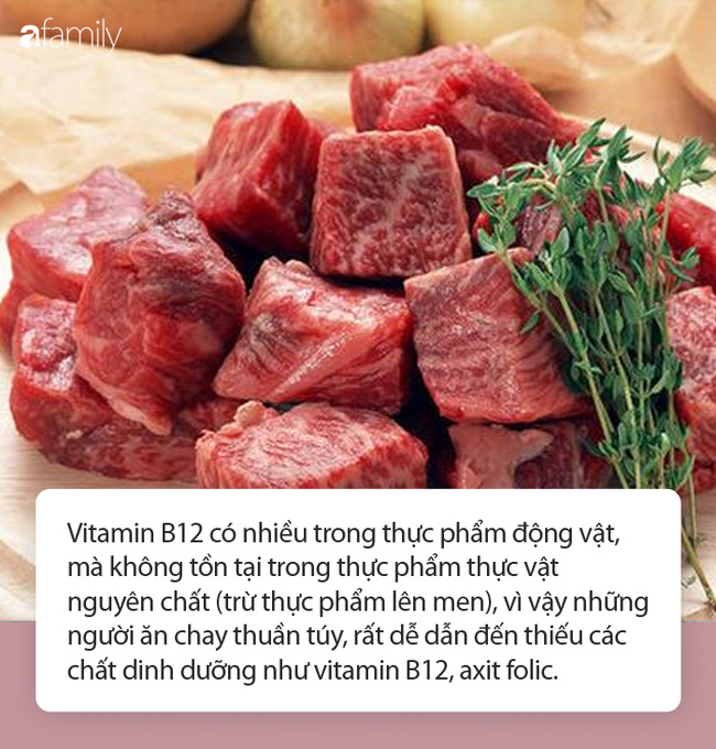 Điều đãng chú ý là vitamin B12 có nhiều trong thực phẩm động vật, mà không tồn tại trong thực phẩm thực vật nguyên chất (trừ thực phẩm lên men), vì vậy những người ăn chay thuần túy, rất dễ dẫn đến thiếu các chất dinh dưỡng như vitamin B12, axit folic.