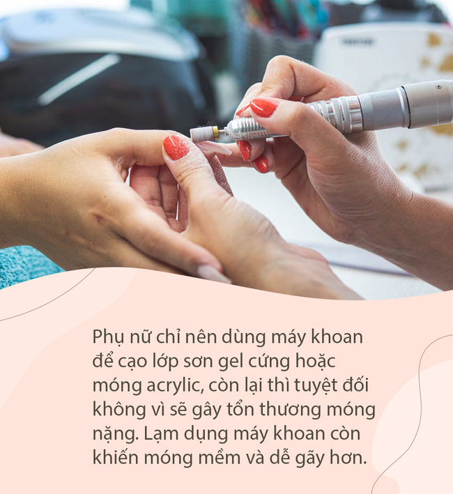 "Phụ nữ chỉ nên dùng máy khoan để cạo lớp sơn gel cứng hoặc móng acrylic, còn lại thì tuyệt đối không vì nó sẽ gây tổn thương móng nặng. Lạm dụng máy khoan còn khiến móng mềm và dễ gãy hơn" – Mabelyn Martin, giám đốc sáng tạo ở tiệm nail nổi tiếng Paintbox (Mỹ), chia sẻ