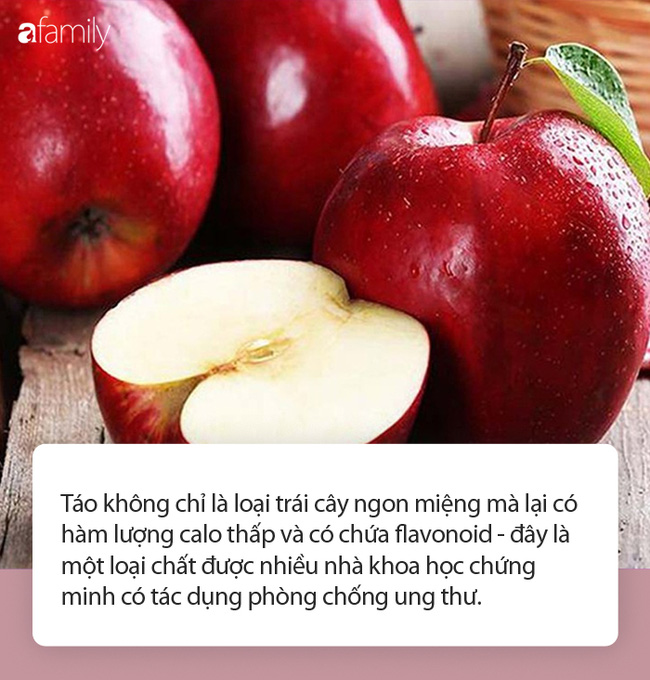 Trong Trung y có câu: "Ăn một quả táo mỗi ngày, bạn sẽ không cần đến gặp bác sĩ". Táo không chỉ là loại trái cây ngon miệng mà lại có hàm lượng calo thấp và có chứa flavonoid - đây là một loại chất được nhiều nhà khoa học chứng minh có tác dụng phòng chống ung thư.