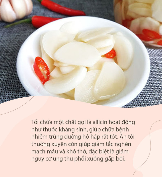 Tỏi vốn có mùi hăng khá mạnh nên khá nhiều người không thích nó. Tuy nhiên, nó chứa một chất gọi là allicin hoạt động như thuốc kháng sinh, giúp chữa bệnh nhiễm trùng đường hô hấp rất tốt. Ăn tỏi thường xuyên còn giúp giảm tắc nghẽn mạch máu và khó thở, đặc biệt là giảm nguy cơ ung thư phổi xuống gấp bội.