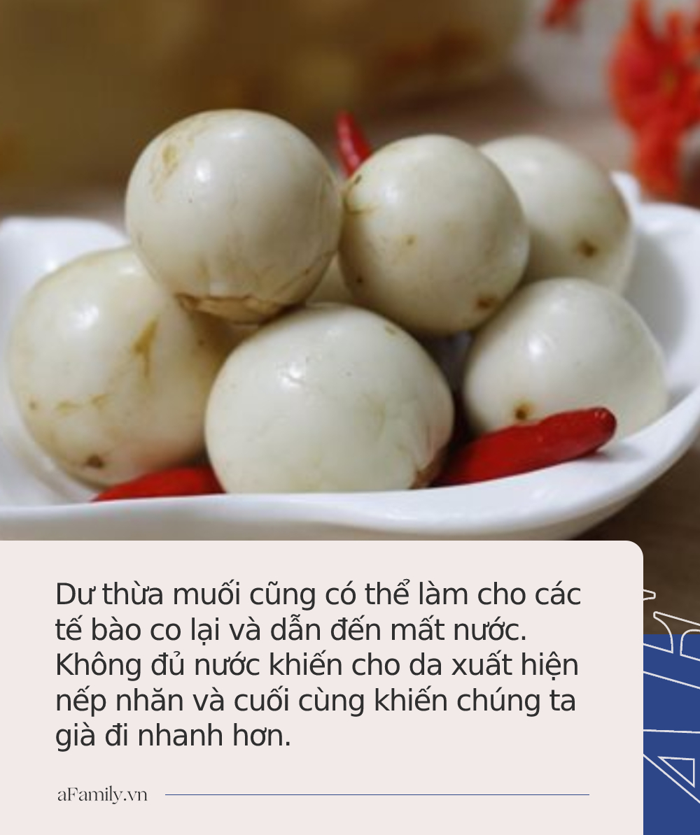 Tiêu thụ quá nhiều natri có thể gây ra tình trạng huyết áp cao và làm tăng nguy cơ mắc bệnh tim và đột quỵ. Điều này càng nguy hiểm hơn với những người lớn tuổi, vì khi chúng ta già đi, các động mạch của chúng ta có xu hướng cứng lại và dễ bị tổn thương bởi natri hơn. Ngoài ra trong nhiều trường hợp, dư thừa muối cũng có thể làm cho các tế bào co lại và dẫn đến mất nước. Không đủ nước khiến cho da xuất hiện nếp nhăn và cuối cùng khiến chúng ta già đi nhanh hơn.